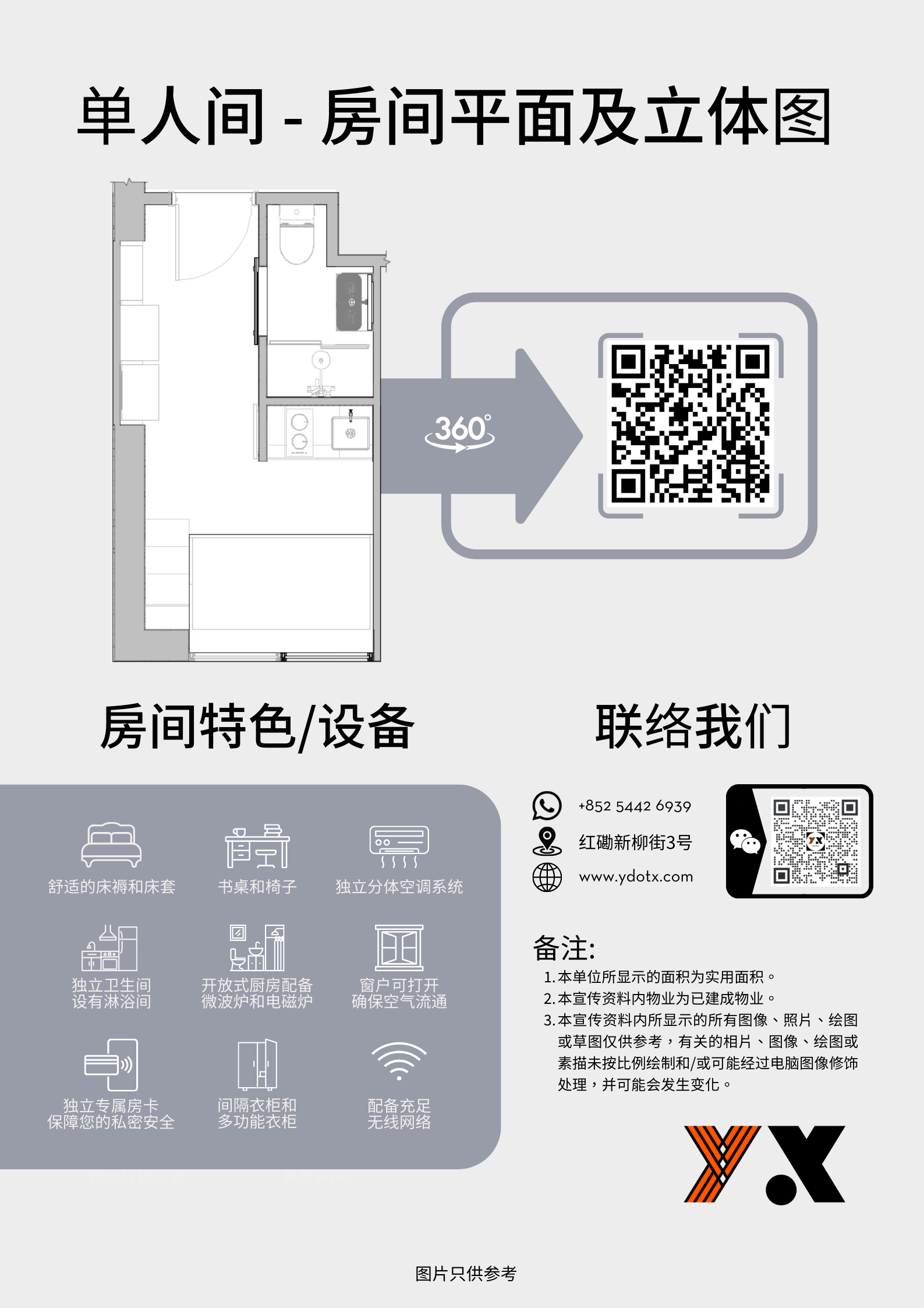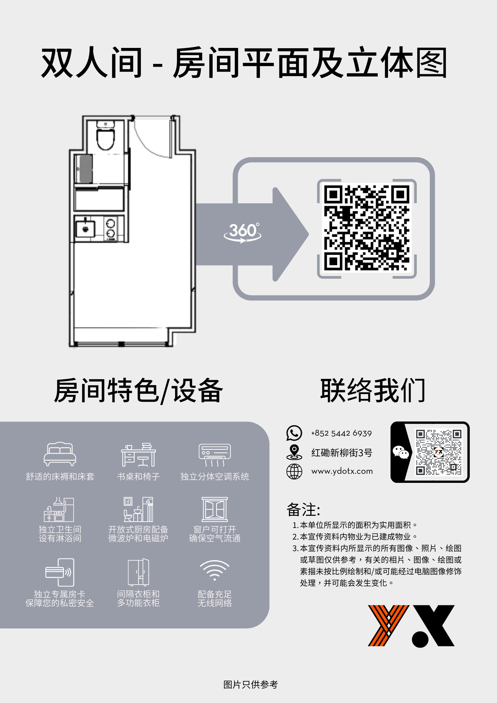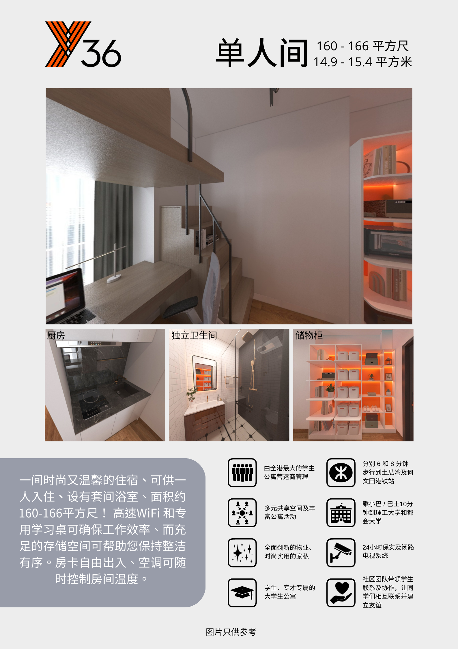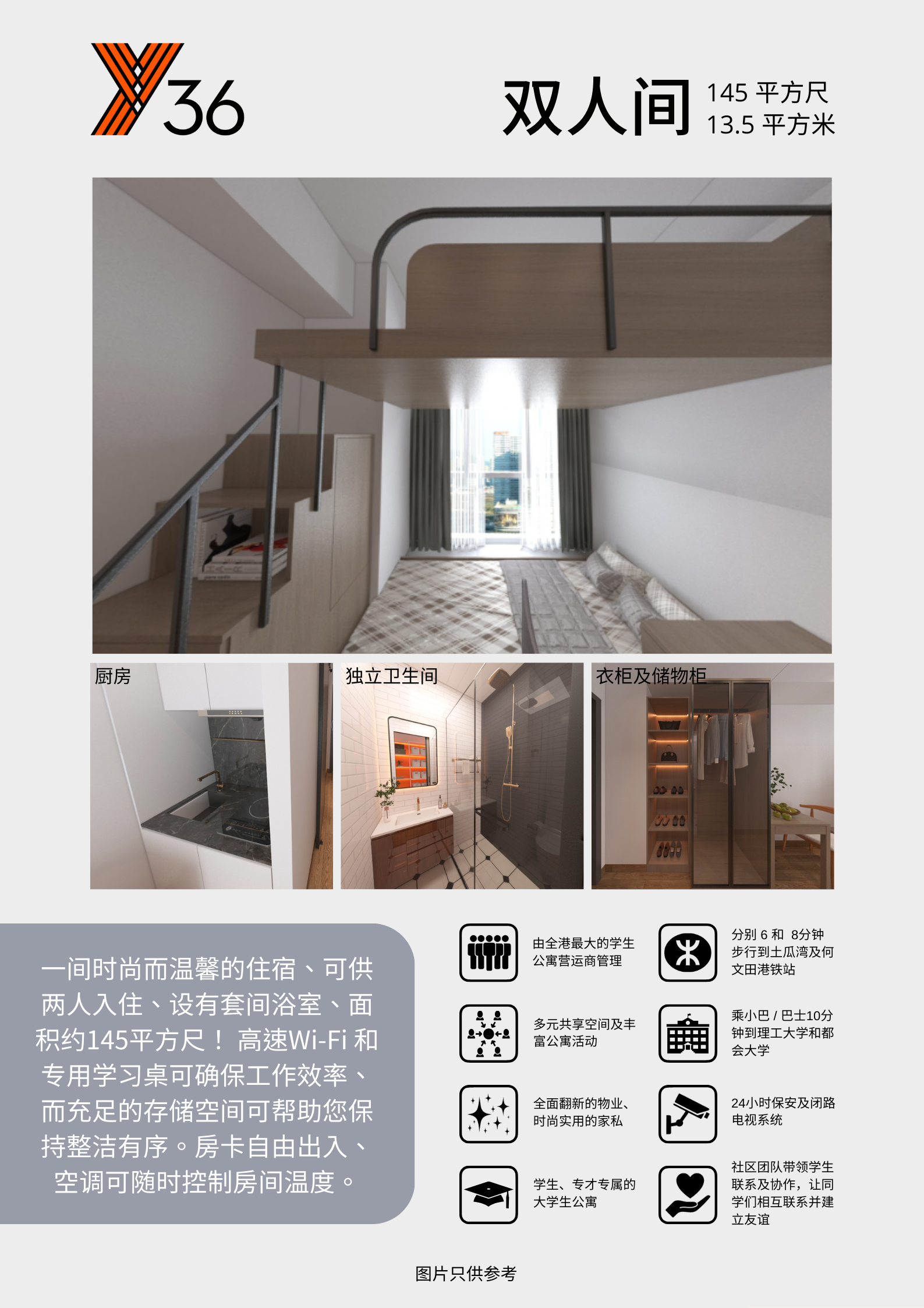 共有82張床位,採用一梯三戶設計,配備24小時安全監控系統,讓您擁有安心無憂的住宿享受。不論是舒適的單人房、雙人床在Y36應有盡有!每戶內更設有獨立廚房及乾濕分離的浴室,並配備全屋Wi-Fi,滿足您的日常所需。