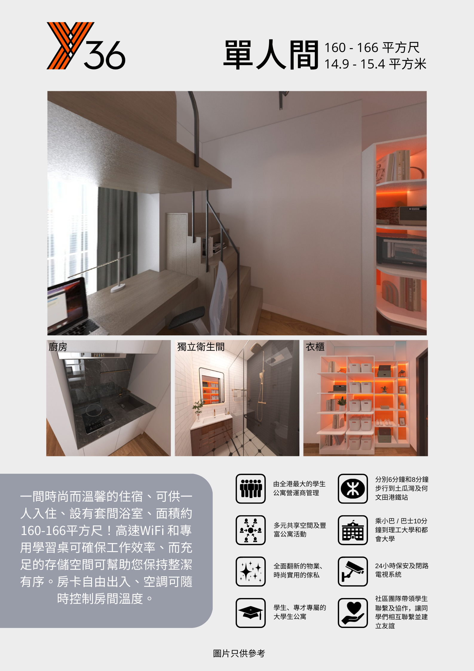 此外,Y36亦精心設計了設備齊全的共用廚房,並設有私人學習空間,以支援住客日常繁忙的4學習和工作生活。